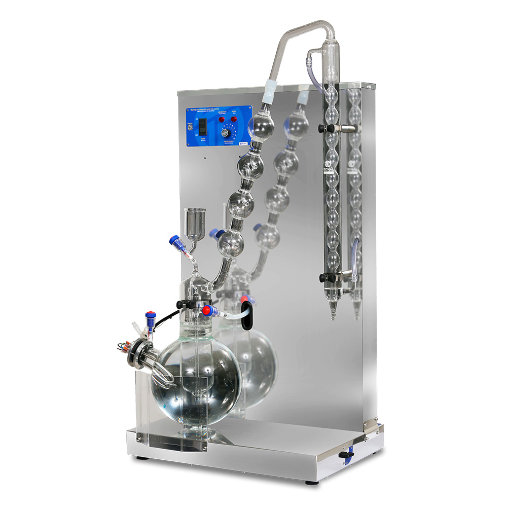 - Glassware: Ball-type condenser and boiler with measuring cup, supply system, stop-flow valve and drain for cleaning made of borosilicate glass