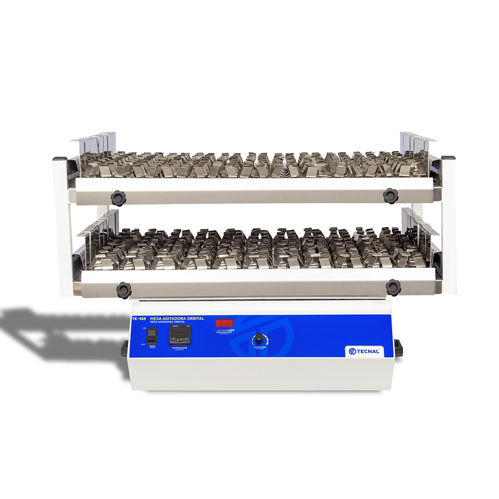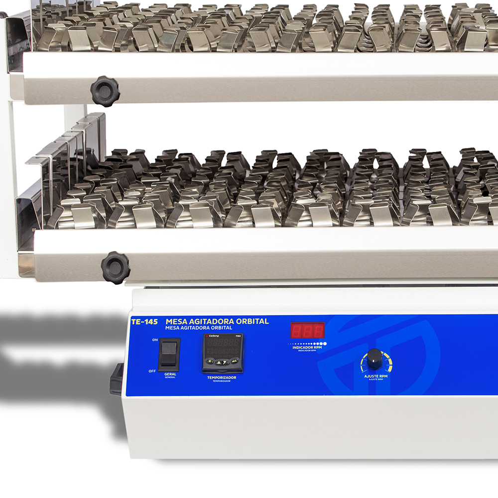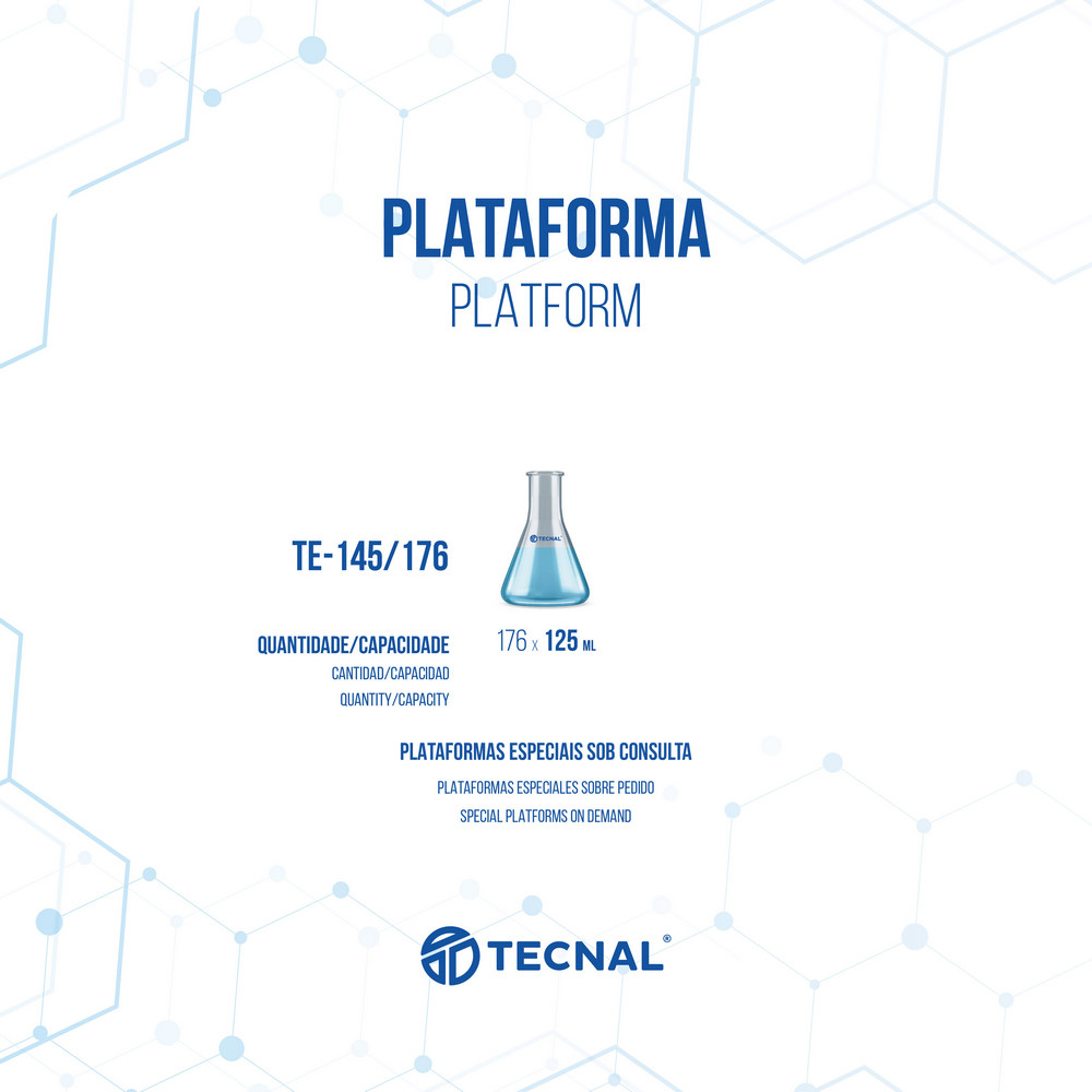 - Viene con: 01 Plataforma con dos niveles ref. TE-145-B-176P en aluminio (16 bandejas en inoxidable 430 con 11 agarradores para Erlenmeyers de 125 ml ref. TECSOLO-125-ML; Capacidad total: 176 Erlenmeyers de 125 ml); No viene con los vidrios de Erlenmeyers; Dimensiones: alto= 330 mm x profundo=675 mm x ancho= 900 mm; 02 Fusibles extra; 02 Tornillos para fijación