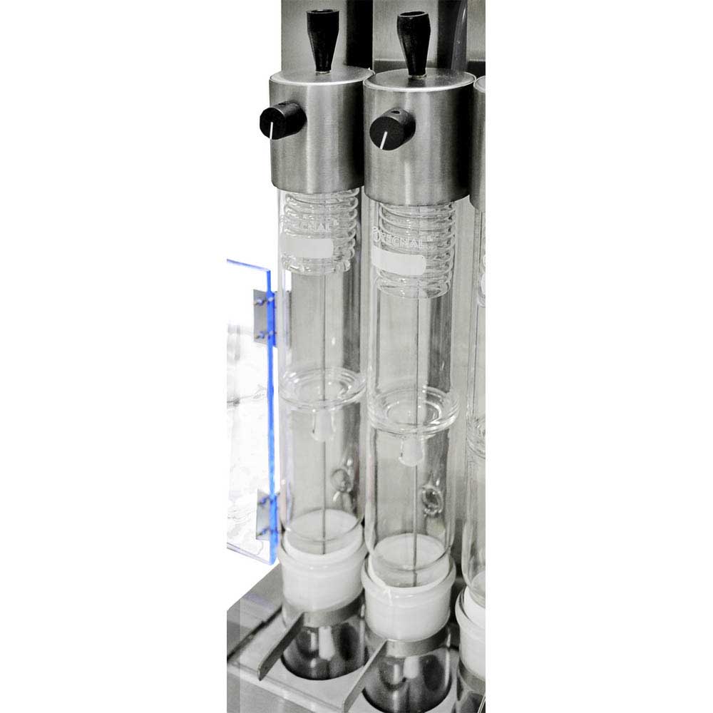- Sistema extracción/recuperación: Extractor/recuperador acoplado con condensador tipo serpentina, constituidos en vidrio borosilicato, vástago de inmersión para el movimiento del cesto con la muestra, sistema de bloqueo en teflón para la recuperación del solvente y protección en acrílico contra la circulación del aire en el extractor