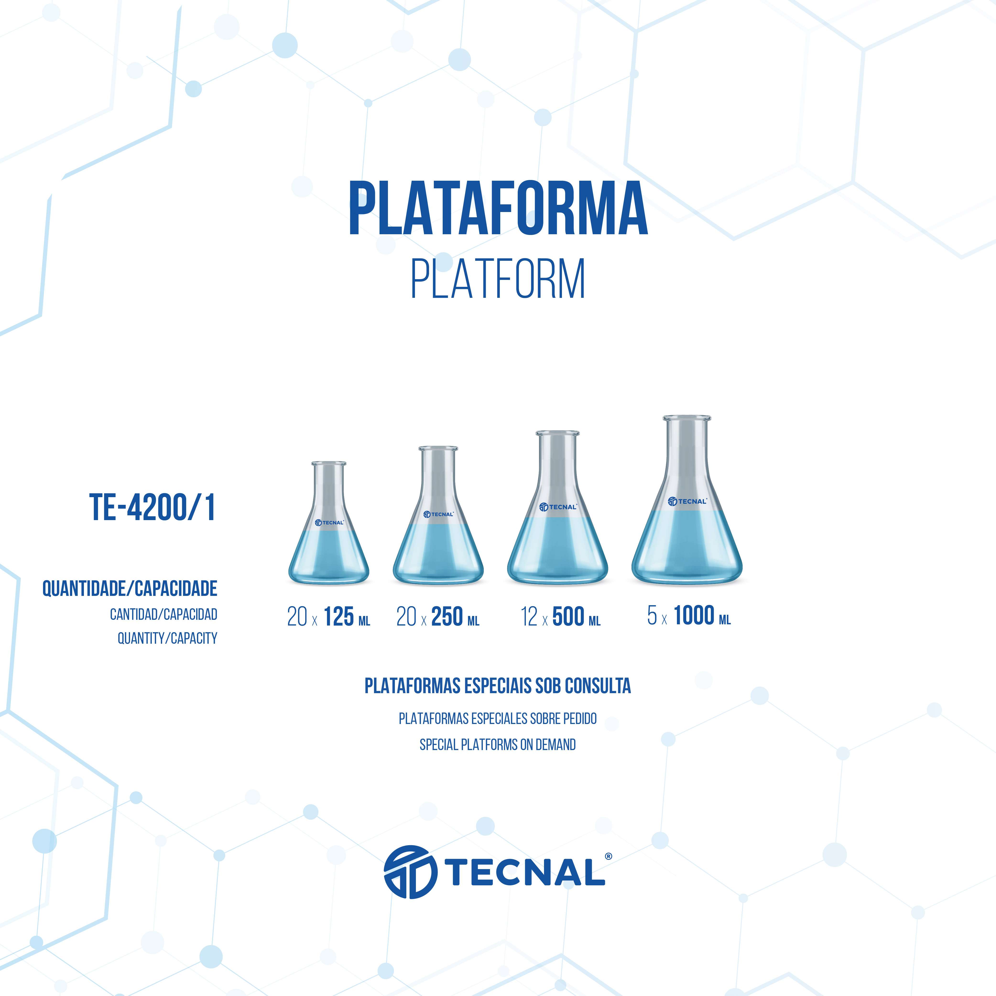 - Plataforma: Simples: 12 Erlenmeyer de 125 ml; 12 Erlenmeyer de 250 ml; 05 Erlenmeyer de 500 ml; 03 Erlenmeyer de 1000 ml; (Para diferentes construcciones consultar el área técnica)