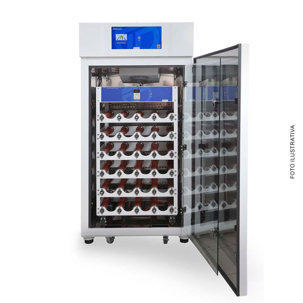 Incubadora con sistema de rotación de frascos/garrafas para multiplicación de células adherentes animales en escala experimental, piloto e industrial. Utilizado en el área farmacéutica veterinaria para la producción de vacunas, inmuno-biológicos, etc.