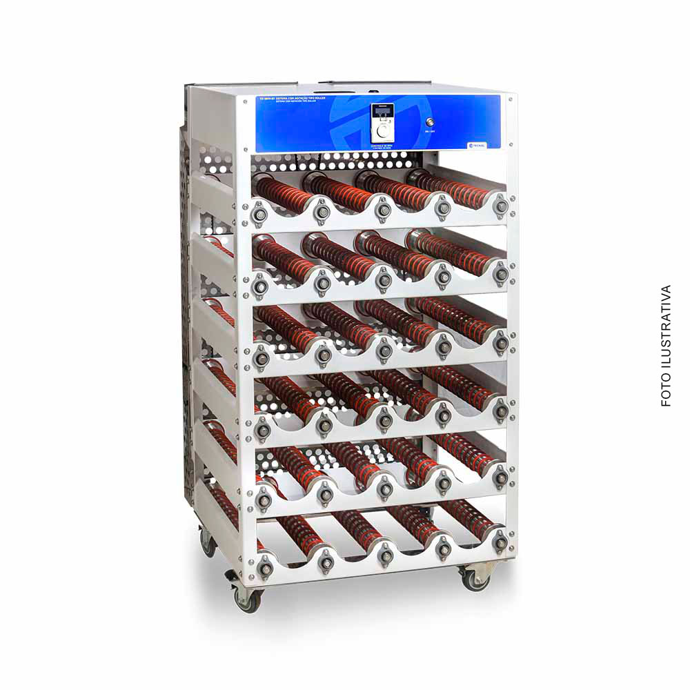- Estructura: Sistema de rodillos para botellas con 6 niveles para agitar 24 botellas de rodillos, distribuidas uniformemente (4 por nivel)