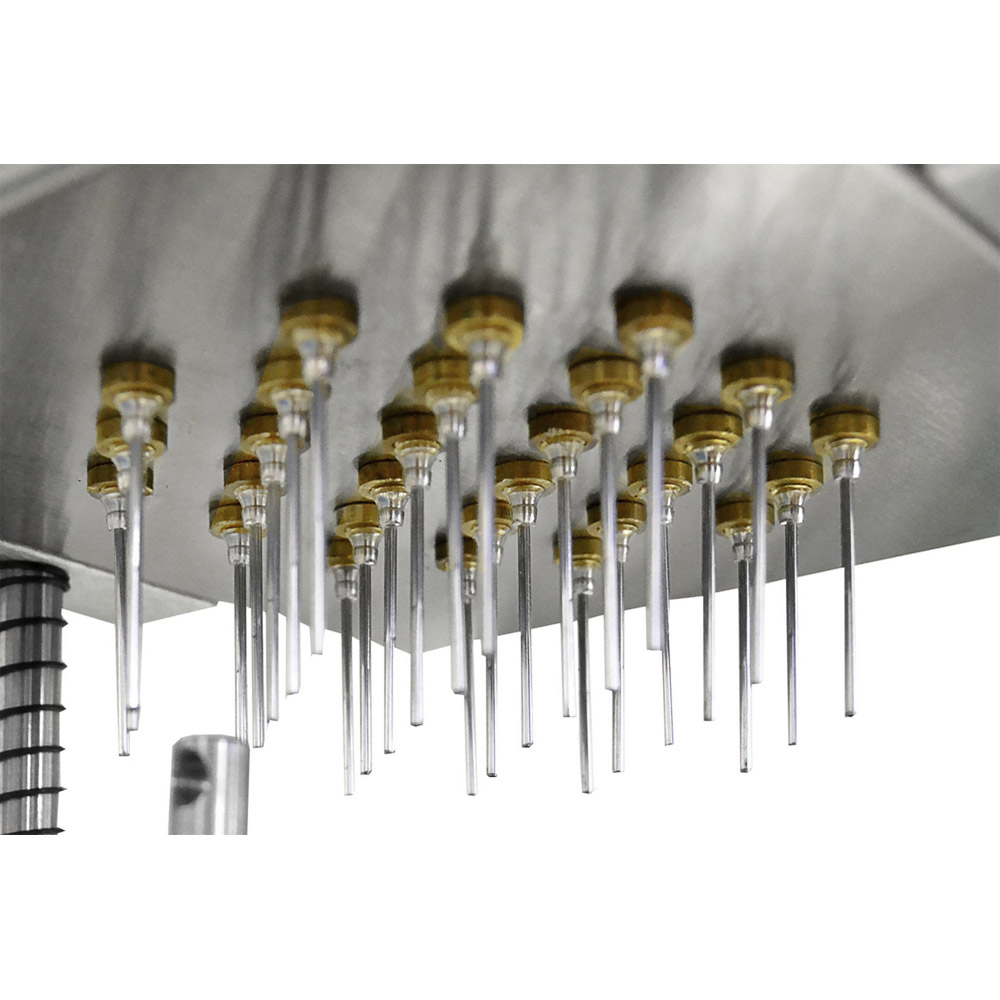 - Sistema de inyección: Constituido de agujas en acero inoxidable 304 y válvulas reguladoras de flujo de nitrógeno o aire comprimido (4 válvulas para bloques de 40 alojamientos y 3 válvulas para bloques de 28 alojamientos)