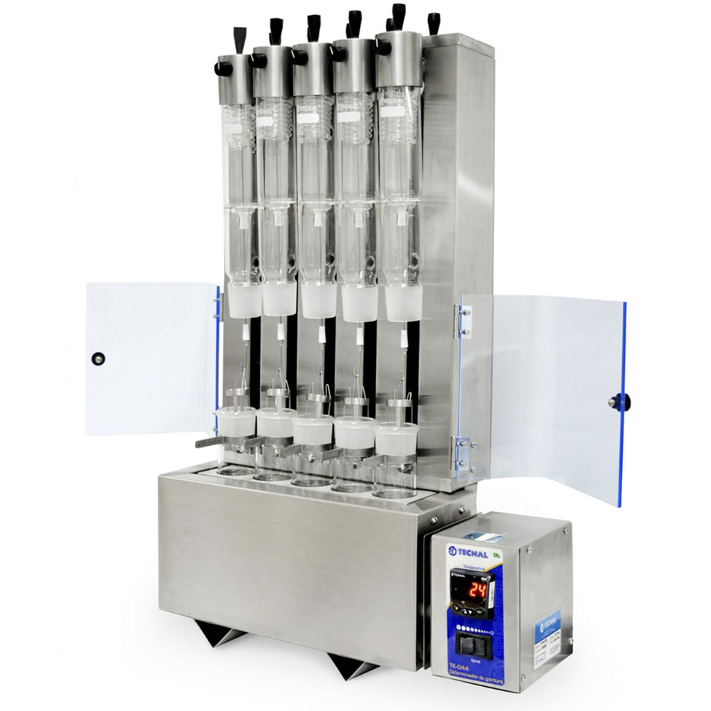 - Extracción y recuperación: Extractor/recuperador acoplado con condensador tipo serpentina, constituidos en vidrio borosilicato, asta de inmersión para el movimiento de la canasta con muestra, sistema de traba en teflón para recuperación del solvente y protección en acrílico contra circulación de aire en el extractor