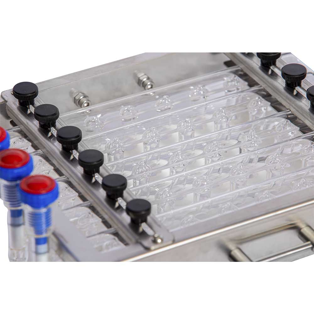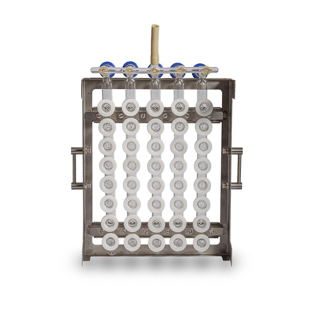 - Capacidad: 40 tubos micro Ø 25 x 250 mm divididos en 5 manifolds en vidrio borosilicato