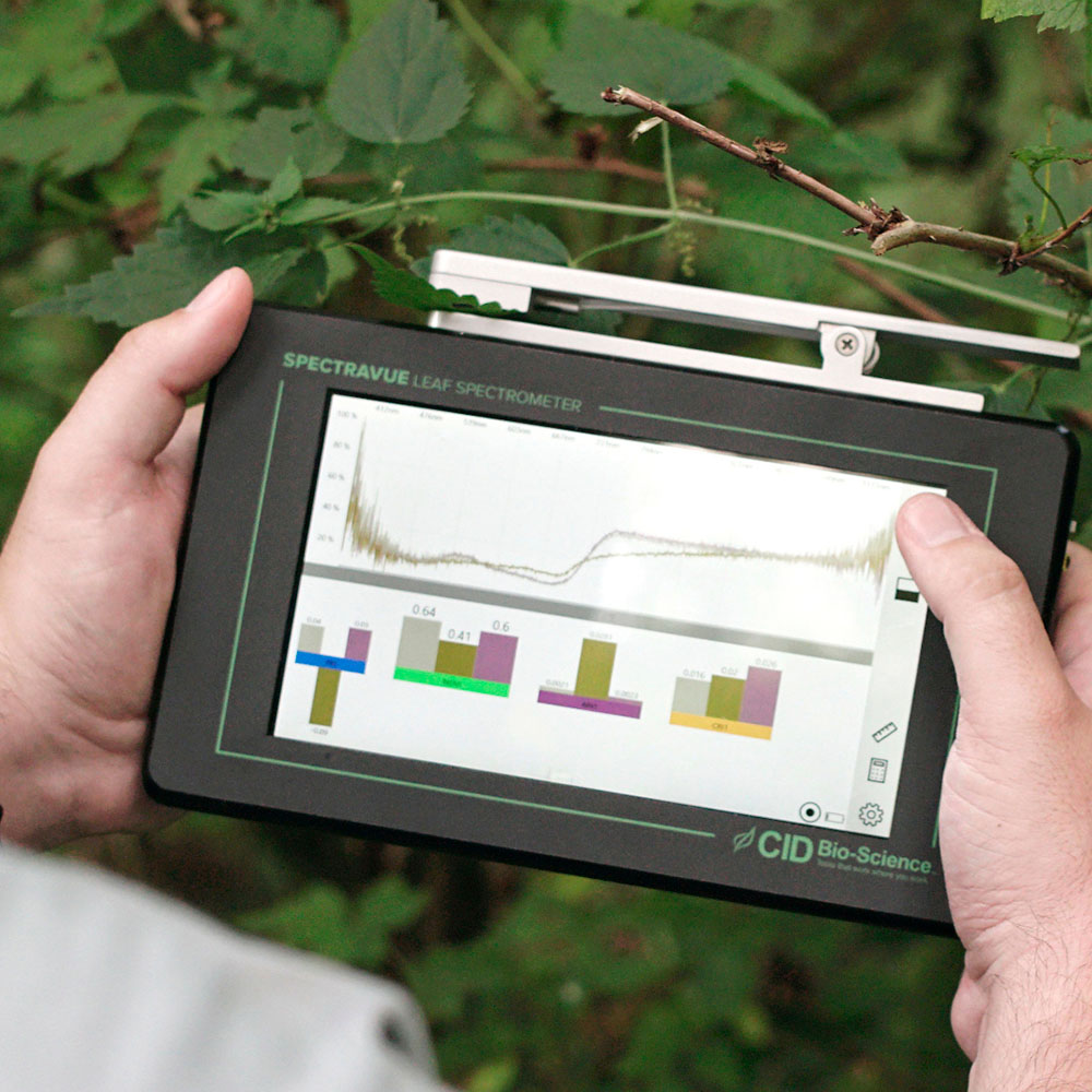O espectrômetro de folha CI-710s SPECTRAVUE foi projetado para medir simultaneamente a transmissão, absorção e reflexão da luz por substâncias biológicas em uma ampla faixa de comprimentos de onda que cobrem a luz visível e infravermelho próximo (NIR).